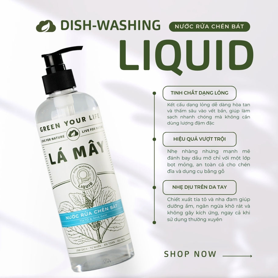 Nước Rửa Chén Bát Tía Tô & Nha Đam (Đậm Đặc) của Lá Mây là sự kết hợp hoàn hảo giữa thiên nhiên và công nghệ, mang đến giải pháp làm sạch hiệu quả, thân thiện với sức khỏe và môi trường. Được chiết xuất từ lá tía tô lên men và nha đam tự nhiên, sản phẩm không chỉ làm sạch dầu mỡ, thức ăn bám cứng đầu mà còn bảo vệ làn da tay nhờ tính dịu nhẹ và không chứa hóa chất độc hại.